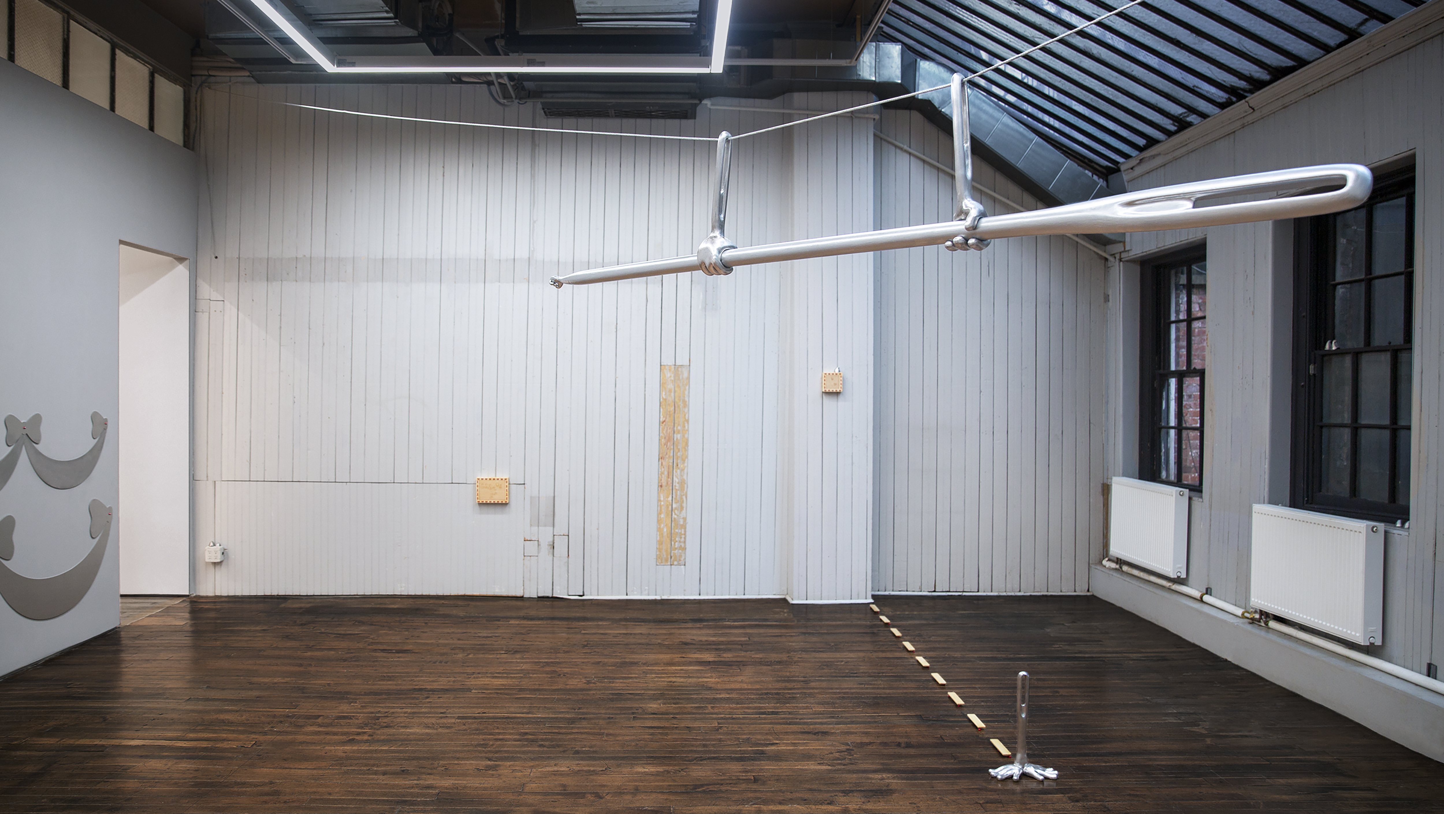 The hem of the hypothetical dress rides low along the wall, as does a shelf of tiny hats reminiscent of the ones the rodent workers wear in the film. These are rendered strange and eternal by aluminum alloy, like much of the rest of the show. Elsewhere in the room, disembodied hands from the film merge with the needle itself, following dotted lines along the floor and wall space. The rodents' efforts are beautiful, precise, and otherworldly — but where is the tailor?